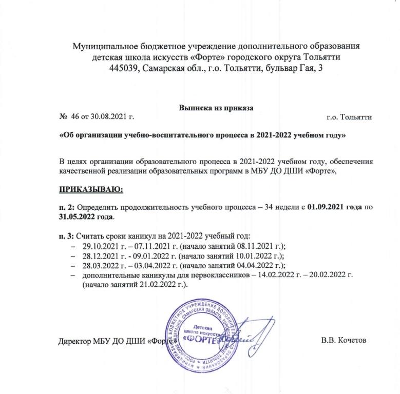 Выписка из приказа № 46 от 30.08.2021