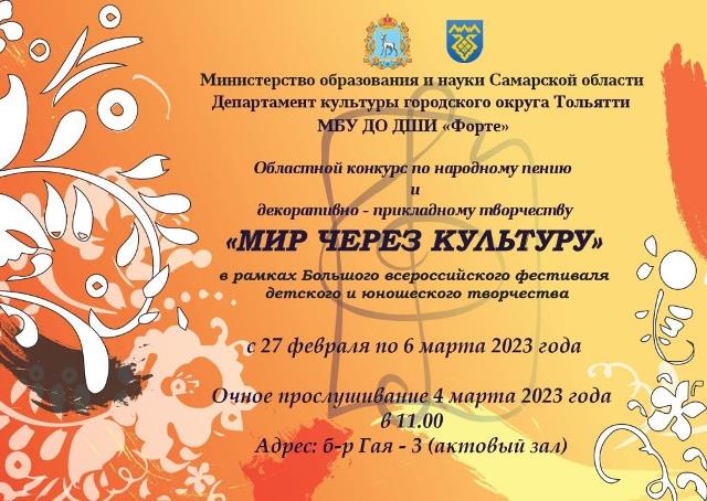 Приглашаем вас принять участие в областном конкурсе по народному пению и декоративно-прикладному творчеству "Мир через культуру". Сроки проведения февраль-март 2025 года. Формат проведения очно-заочный (по выбору участников). Конкурс в очном режиме для номинации «Народное пение» состоится 1 марта 2025 года (суббота) в концертном зале ДШИ «Форте»(г.Тольятти, б-р Гая,3).